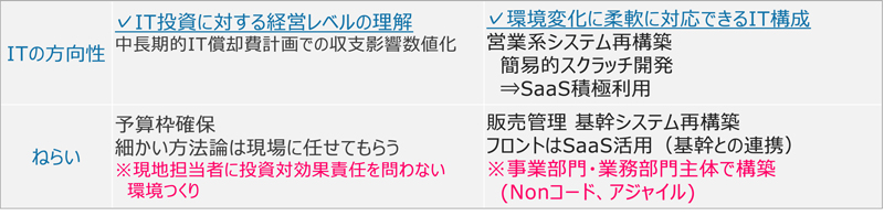 次に、環境変化に柔軟に対応できるIT構成の構築だ。営業系システムの再構築に当たり、販売管理など基幹システムはパッケージで構築し、フロント側のシステムはSaaSを活用して事業環境の変化に柔軟に対応し、ノーコードツールやアジャイル開発を取り入れ、事業部門主体で現場に任せた運用を目指した。