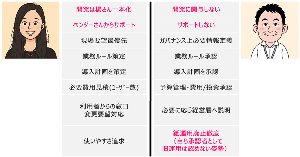現場主導で開発を進めていく上で、まず開発担当者をアサインした。選定基準はIT経験を問わず、「人柄重視」。人柄が抜群な楊氏を抜擢し、開発を一本化した。岡田氏と役割分担し、二人三脚でのkintone導入プロジェクトがスタートしました。