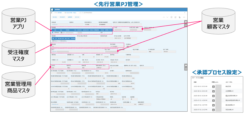 従来は紙ベースで煩雑だった営業案件の承認プロセスを、kintone上での一元管理に変更。以前は紙やエクセルでの管理だったため、まずはマスタデータの整備からスタートした。構築にあたっては、名寄せ作業やフォームの不一致による情報集約作業のデータ移行作業がとても大変だったそうだが、ここを乗り越えて運用が始まると業務効率が格段に高まり、営業活動やプロジェクト管理のデータが蓄積され、粗利率別のプロジェクト管理や営業行動計画、商談記録などの集計・分析が容易になった。